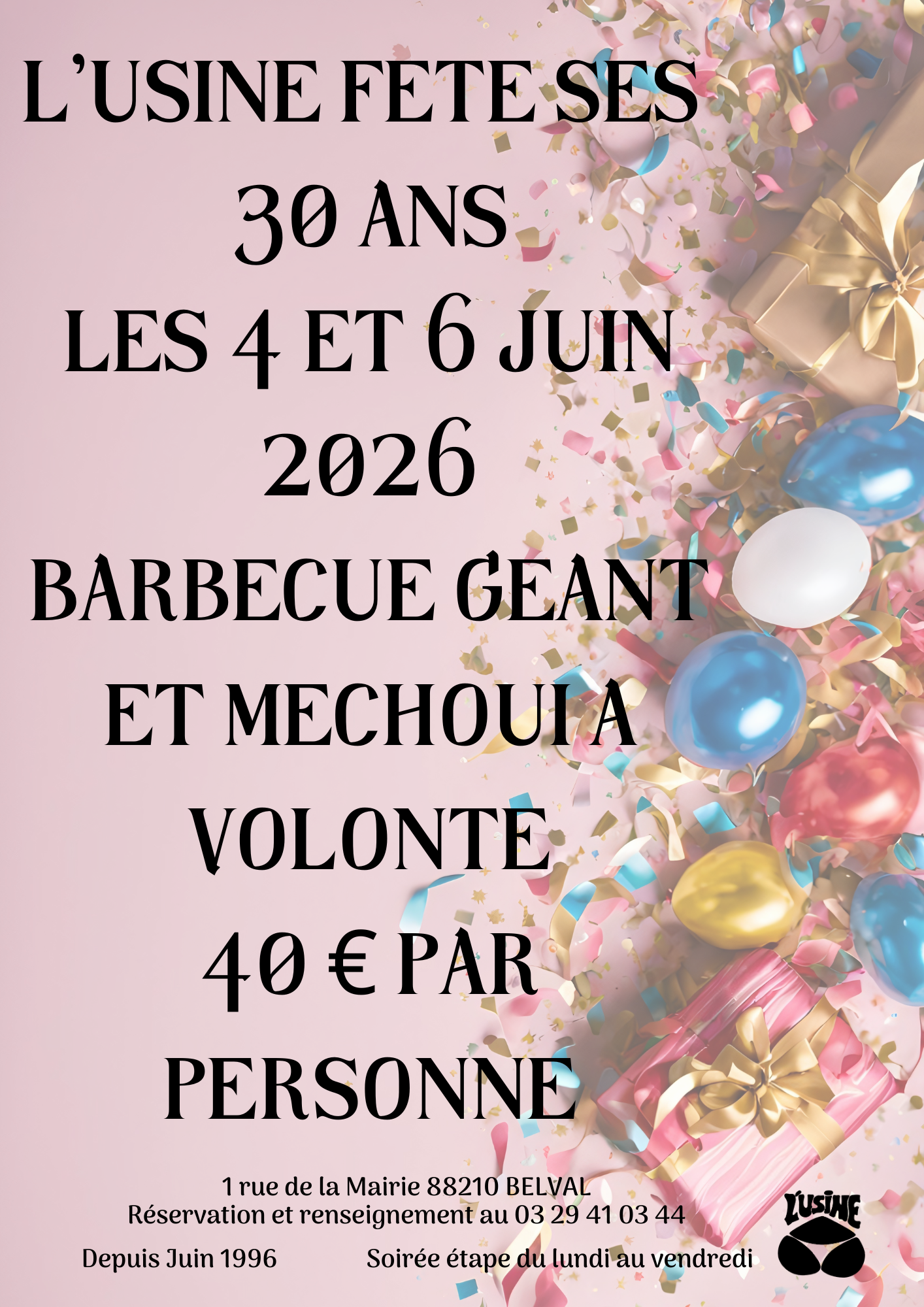 L'ANNIVERSAIRE DE L'USINE Feb 01, 2026 NOUS VOUS PROPOSONS UN BARBECUE ET UN MECHOUI GEANT 40 € PAR PERSONNE BUFFET A VOLONTE